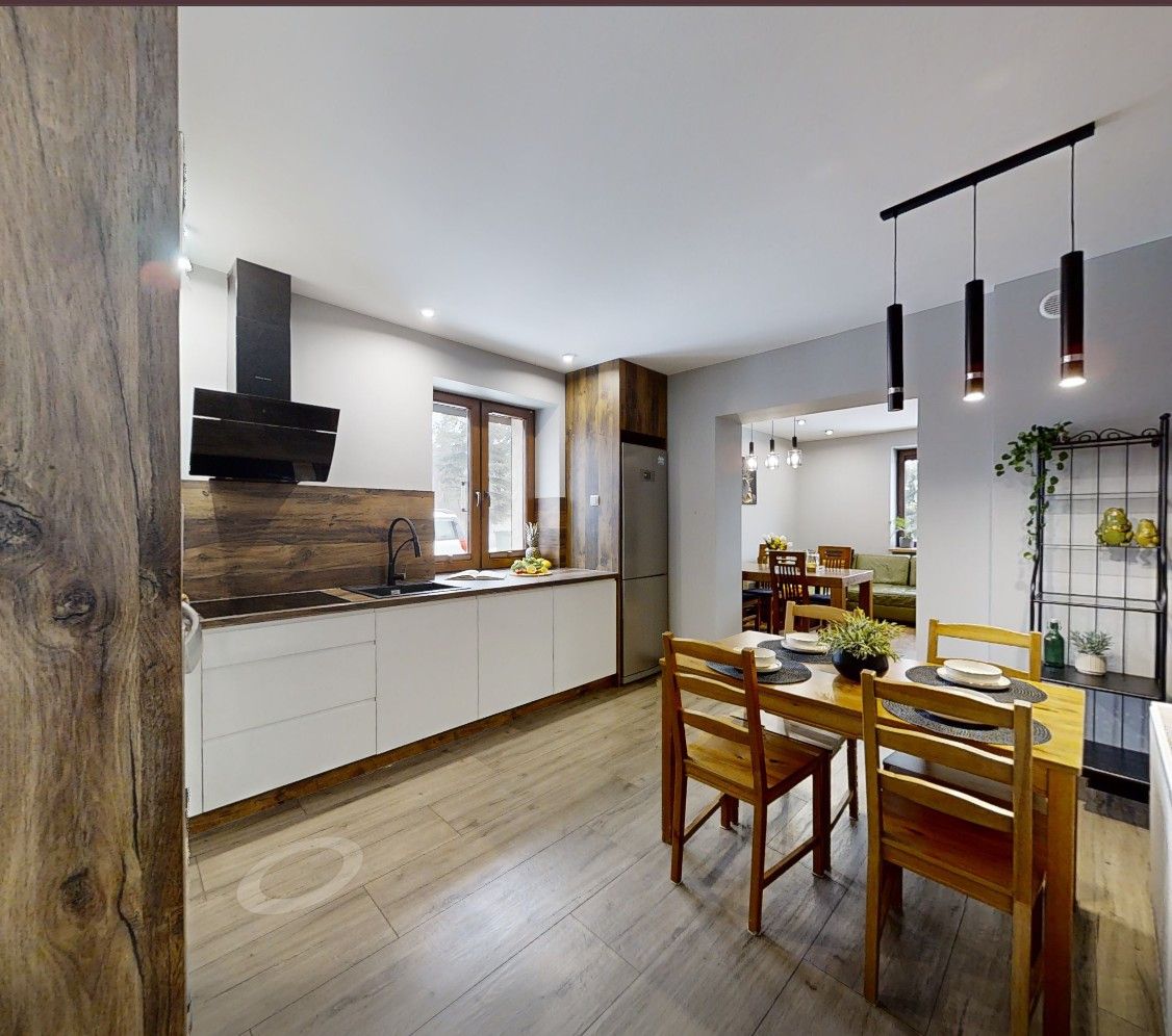 Atutem domu jest funkcjonalny rozkład pomieszczeń z wspólną strefą dzienną - jasna kuchnia z jadalnią płynnie łączy się z pokojem dziennym, tworząc serce domu. Mamy cztery osobne pokoje/ sypialnie (z możliwością wydzielenia piątego) pozwalające dopasować funkcje do potrzeb rodziny — od pokoi dziecięcych, przez gabinet, po przestrzeń do pracy zdalnej. Dwie łazienki - jedna z wanną na poddaszu, druga z prysznicem na parterze.