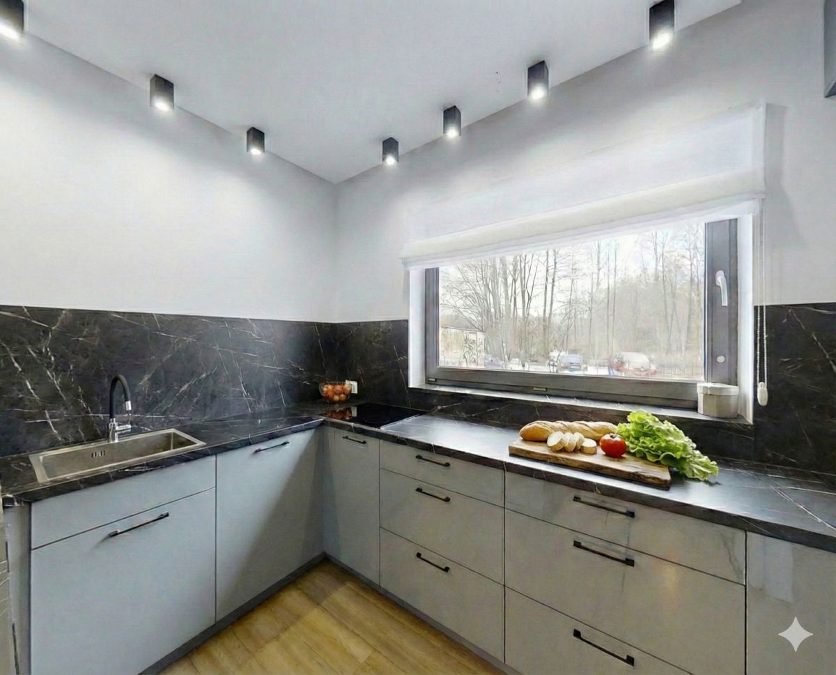 - duży, ponad 30-to metrowy salon połączony z kuchnią, z oknami na 3 strony świata i wyjściem na olbrzymi, drewniany taras,