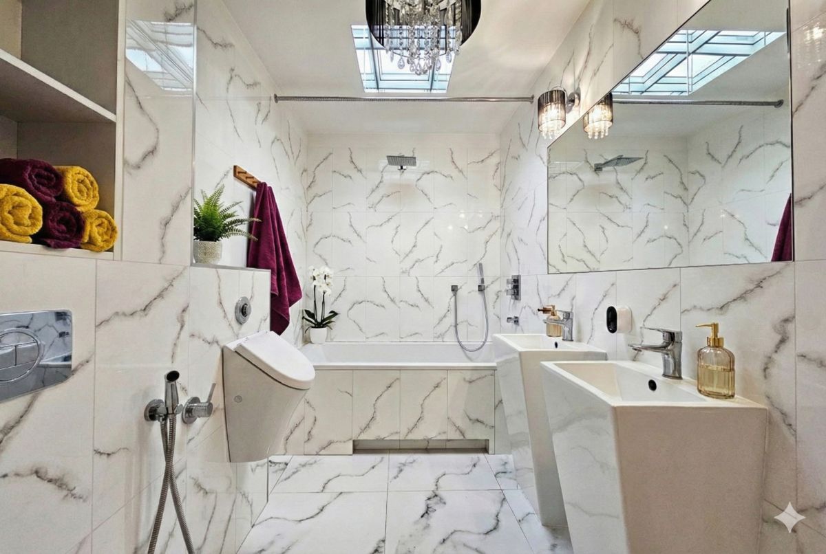 - łazienka z wanną i WC oraz pisuarem z dostępem naturalnego światła przez świetlik dachowy,