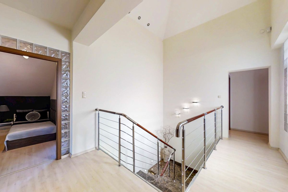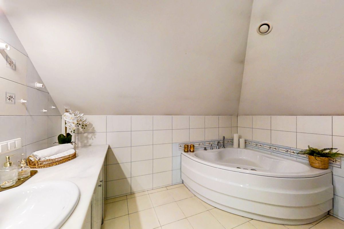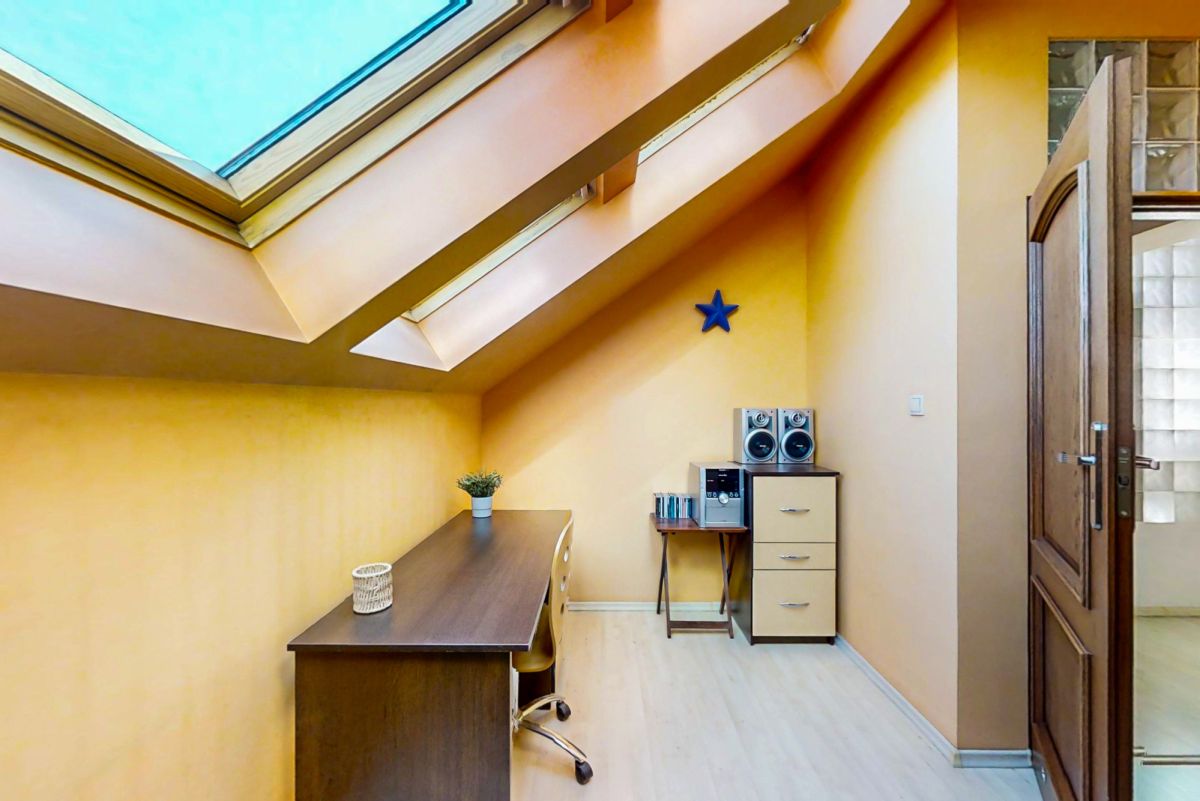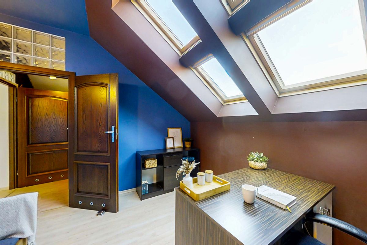Na piętrze mieszczą się dwie komfortowe sypialnie, duża łazienka, garderoba, gabinet oraz osobna pralnia. Całość dopełniają marmurowe schody, które nadają wnętrzu prestiżu i elegancji.