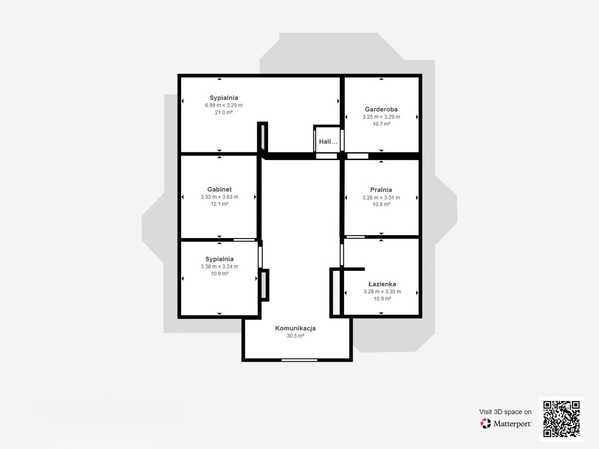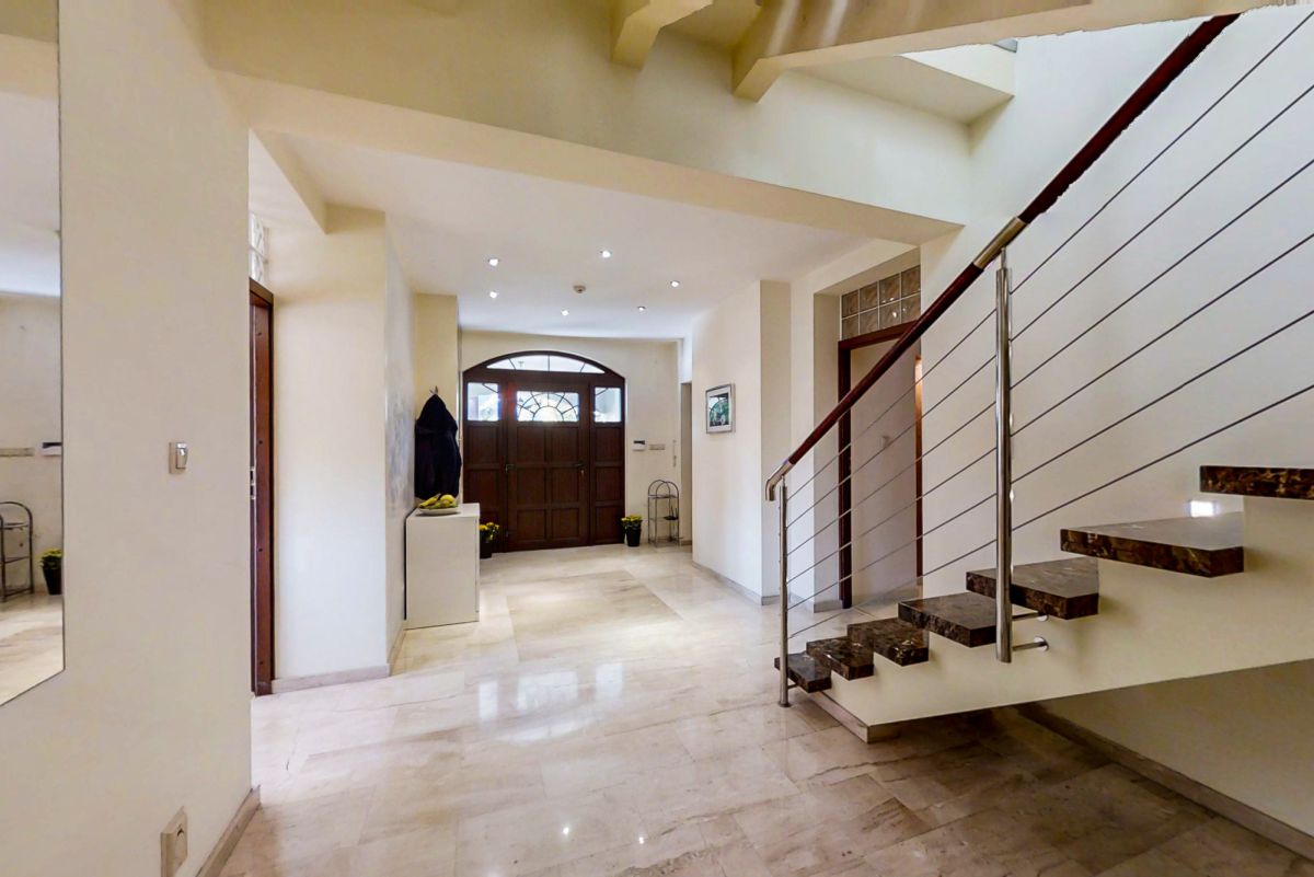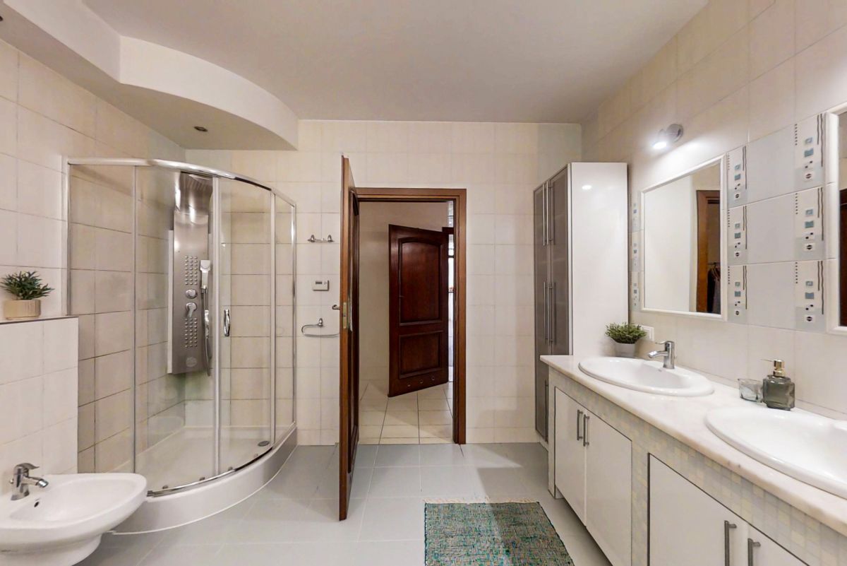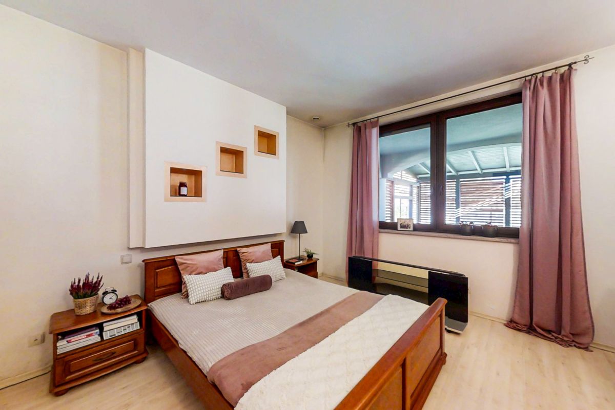 Na piętrze mieszczą się dwie komfortowe sypialnie, duża łazienka, garderoba, gabinet oraz osobna pralnia. Całość dopełniają marmurowe schody, które nadają wnętrzu prestiżu i elegancji.