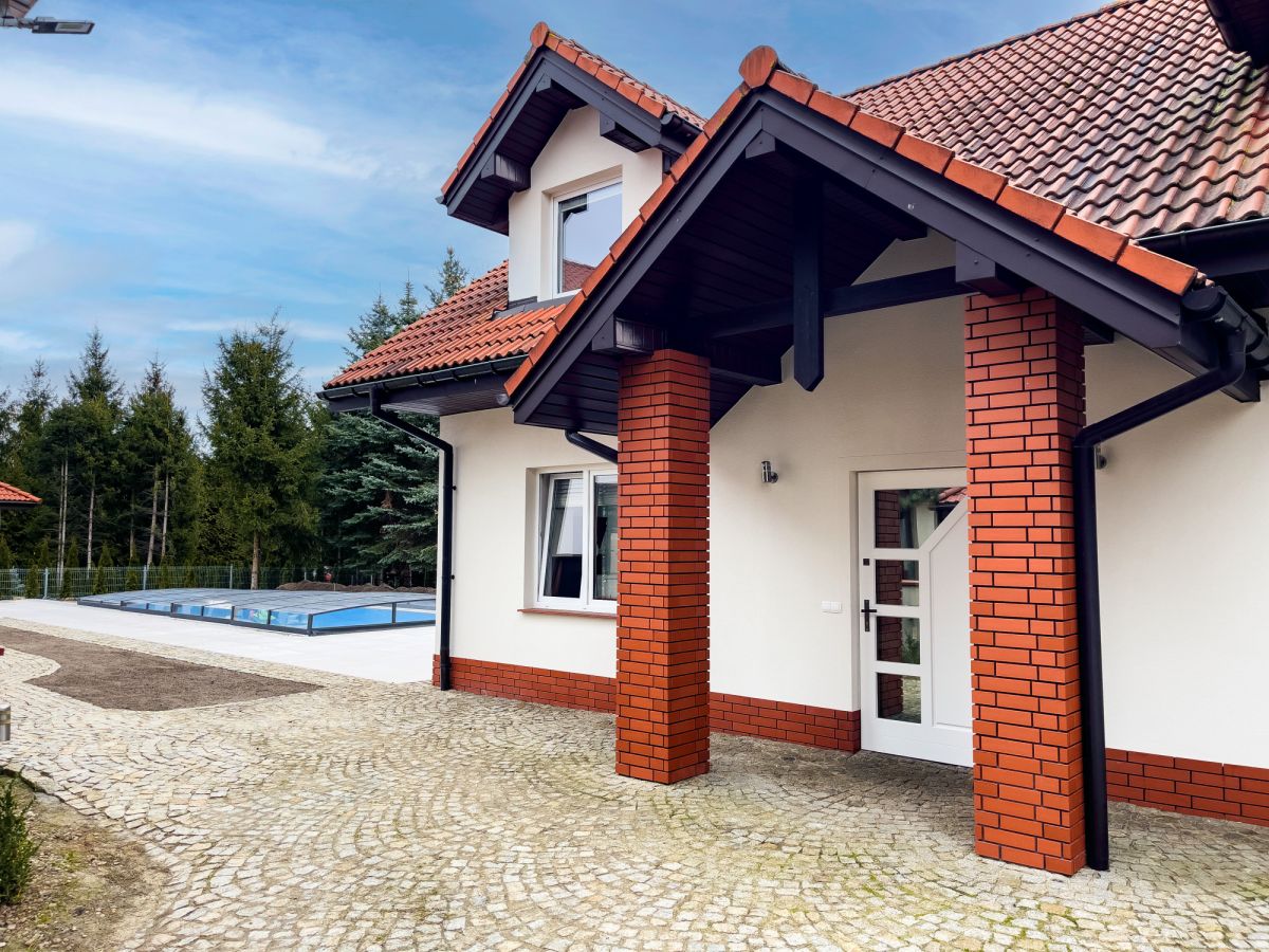 Dom posiada również taras z kostki, garaż jednostanowiskowy oraz dodatkowe miejsce parkingowe przed budynkiem. W sezonie letnim istnieje możliwość korzystania z basenu.