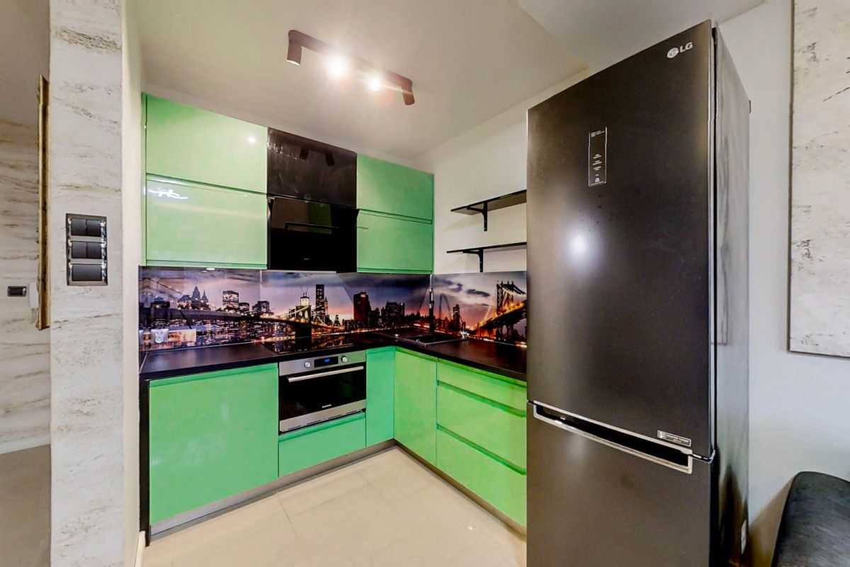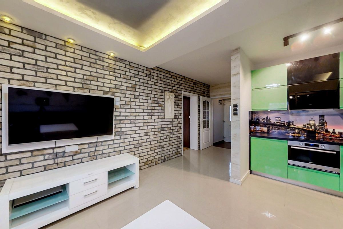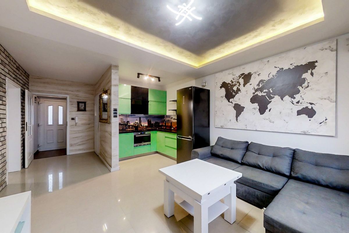 Przestronny salon z aneksem kuchennym, który pełni rolę centralnego punktu mieszkania. Jasne wnętrze sprzyja relaksowi, a nowoczesna kuchnia umożliwia wygodne przygotowywanie posiłków i wspólne spędzanie czasu.