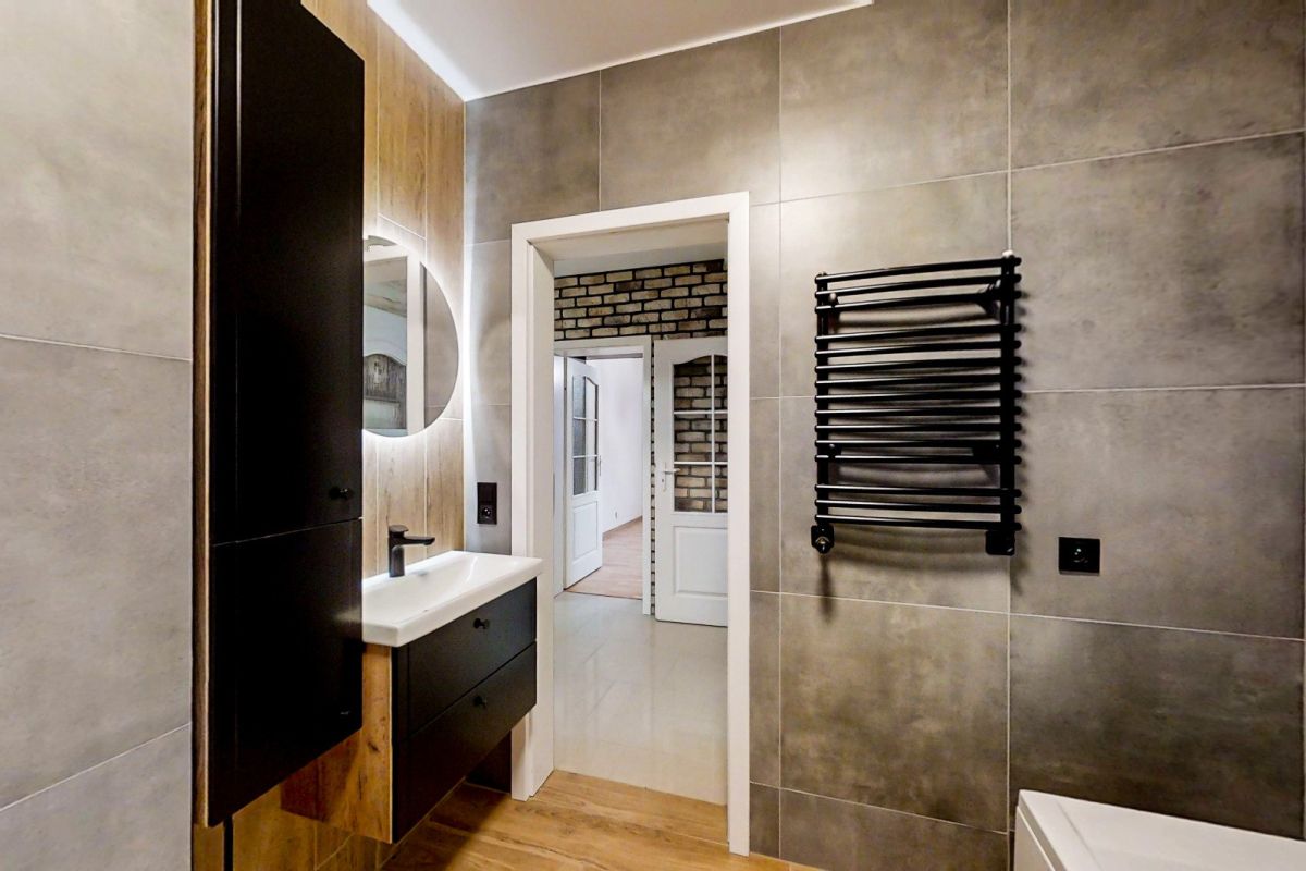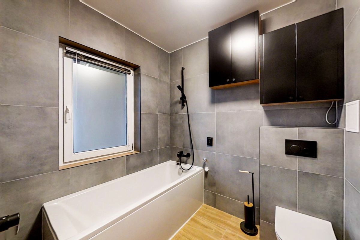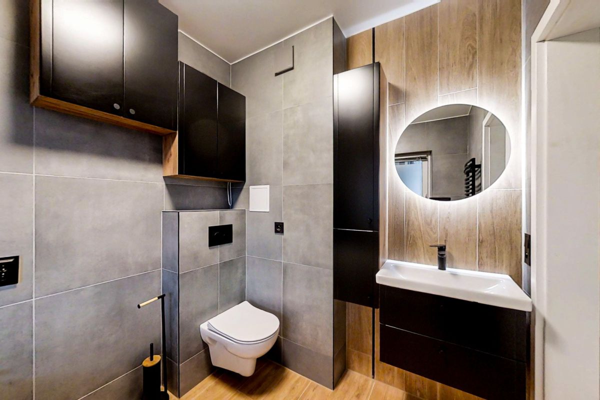 Łazienka, urządzona w nowoczesnym stylu, wyposażona w niezbędne udogodnienia, gwarantująca komfort codziennych czynności.